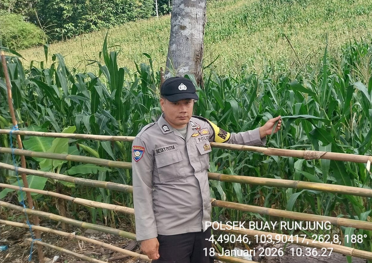 Anggota Bhabinkamtibmas Polsek Buay Runjung, Brigpol Resky Putra, melaksanakan kegiatan sambang sekaligus pengecekan ketahanan pangan di wilayah desa binaannya. Dalam