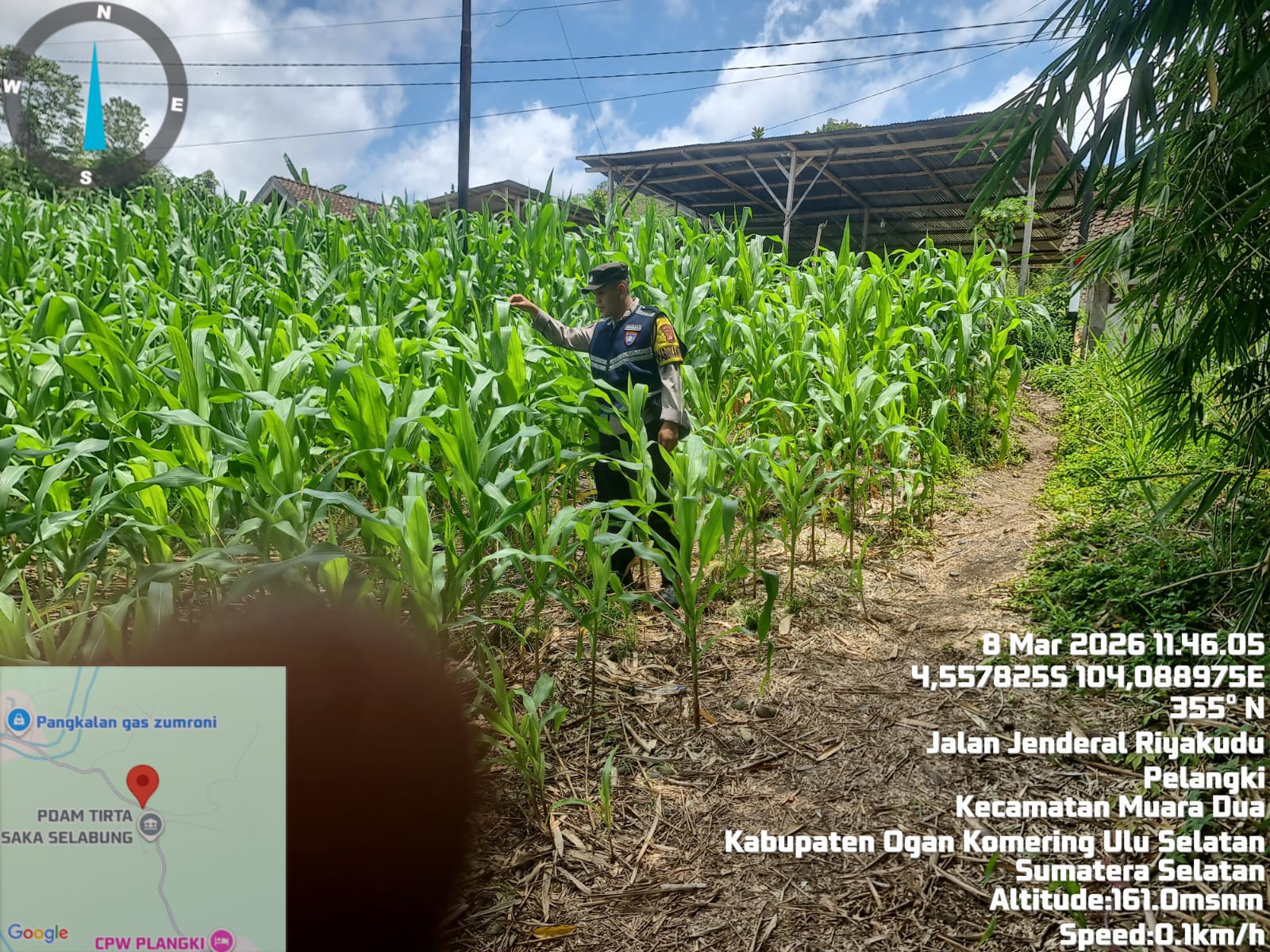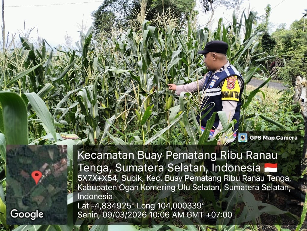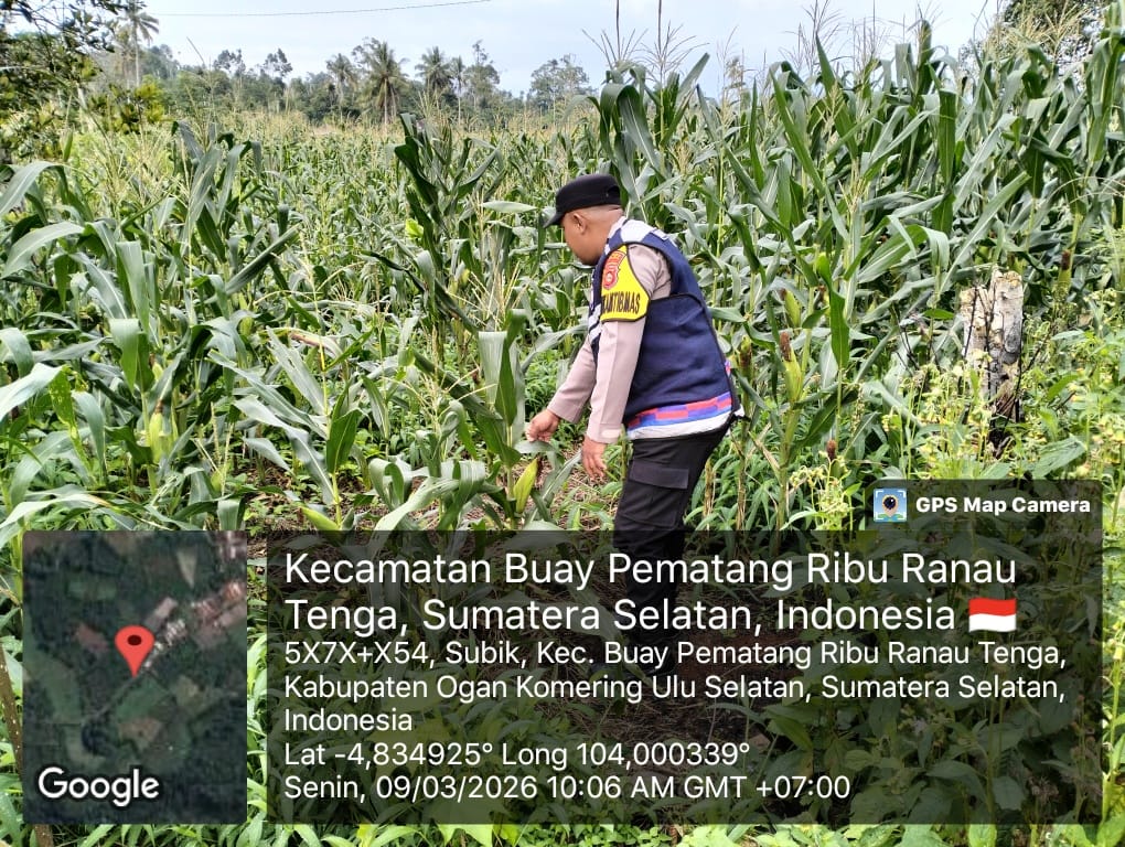 OKU Selatan – Bhabinkamtibmas Polsek Muaradua BRIGPOL Juanda melaksanakan kegiatan pengecekan lahan tanaman jagung di desa binaannya pada Minggu (08/03/2026)