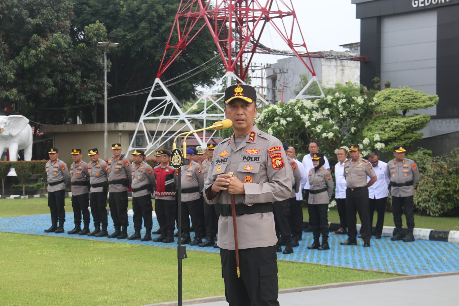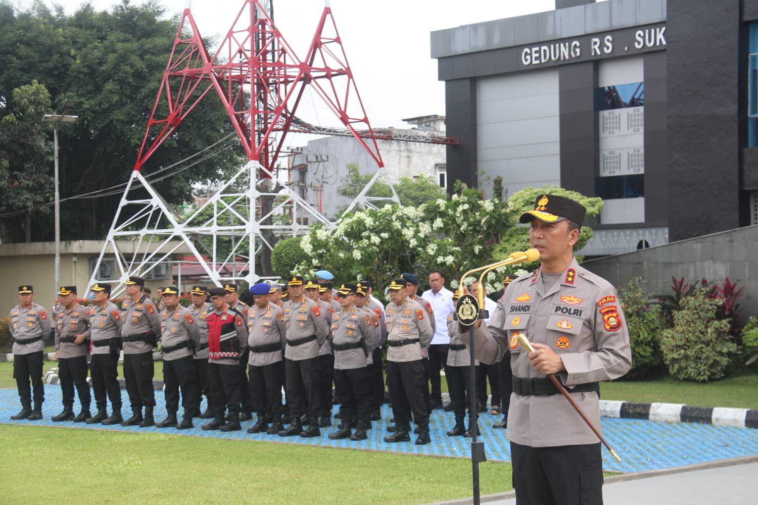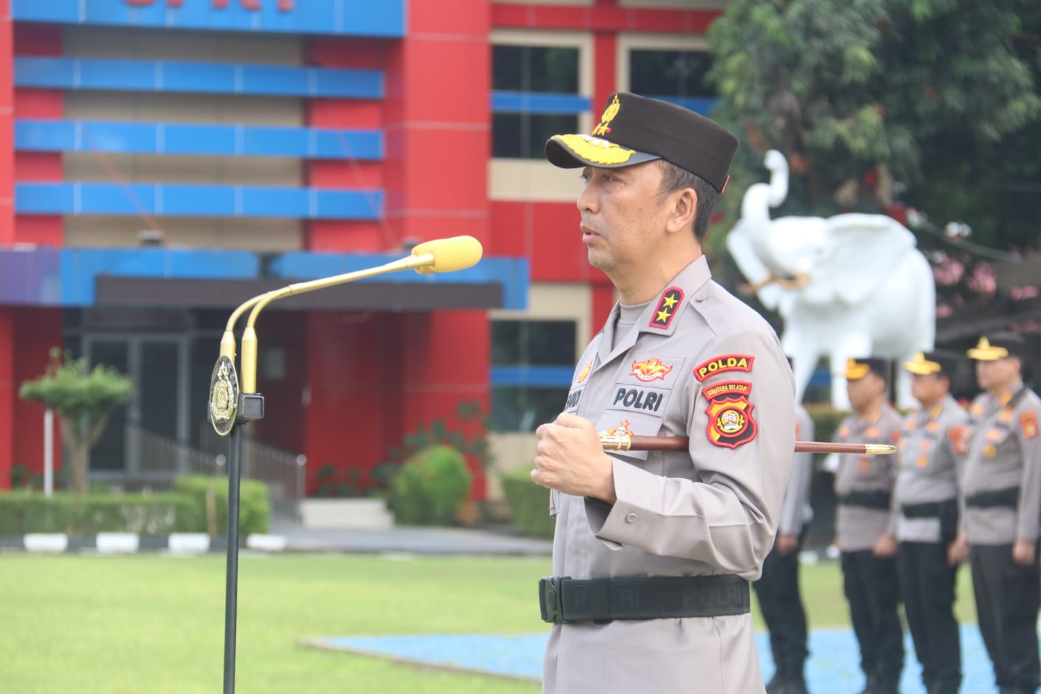 PALEMBANG — Kapolda Sumatera Selatan Irjen Pol Dr. Sandi Nugroho, S.I.K., S.H., M.Hum. memimpin apel pagi seluruh personel di Lapangan