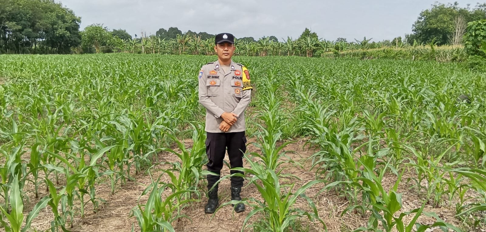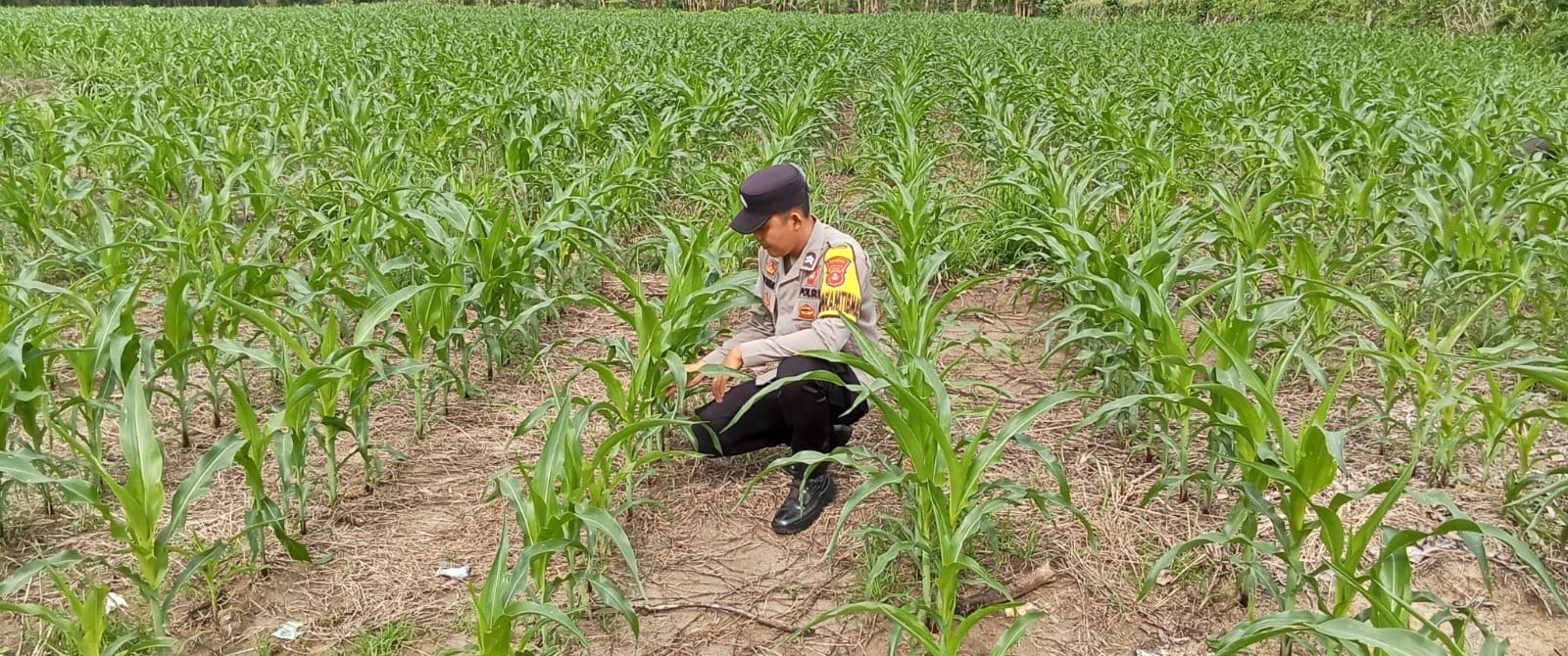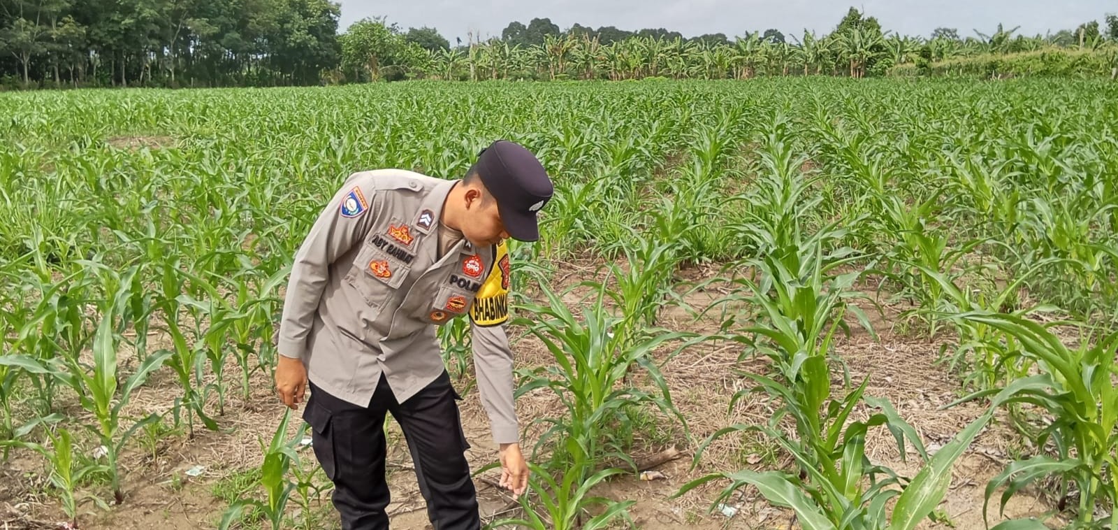 Bhabinkamtibmas Polsek Buay Pemaca, BRIPTU Aby Rahmat, melaksanakan kegiatan pengecekan lahan tanaman jagung yang berada di Desa Serakat Jaya, Kecamatan