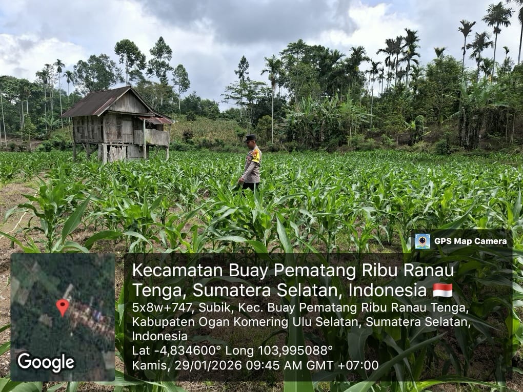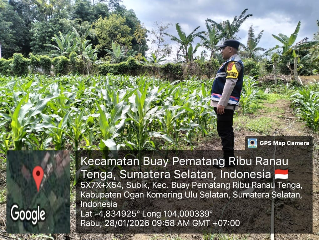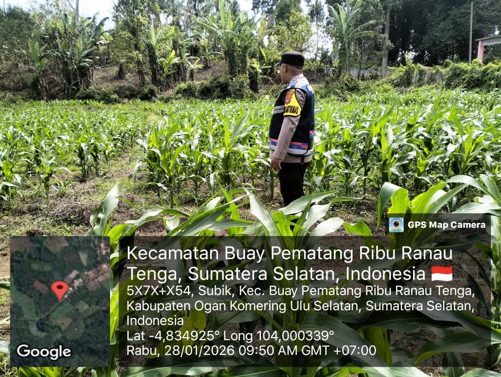 Bhabinkamtibmas Polsek Banding Agung, AIPDA Suswanto, melaksanakan kegiatan pengecekan lahan tanaman jagung di Desa Subik, Kecamatan BPR Ranau Tengah