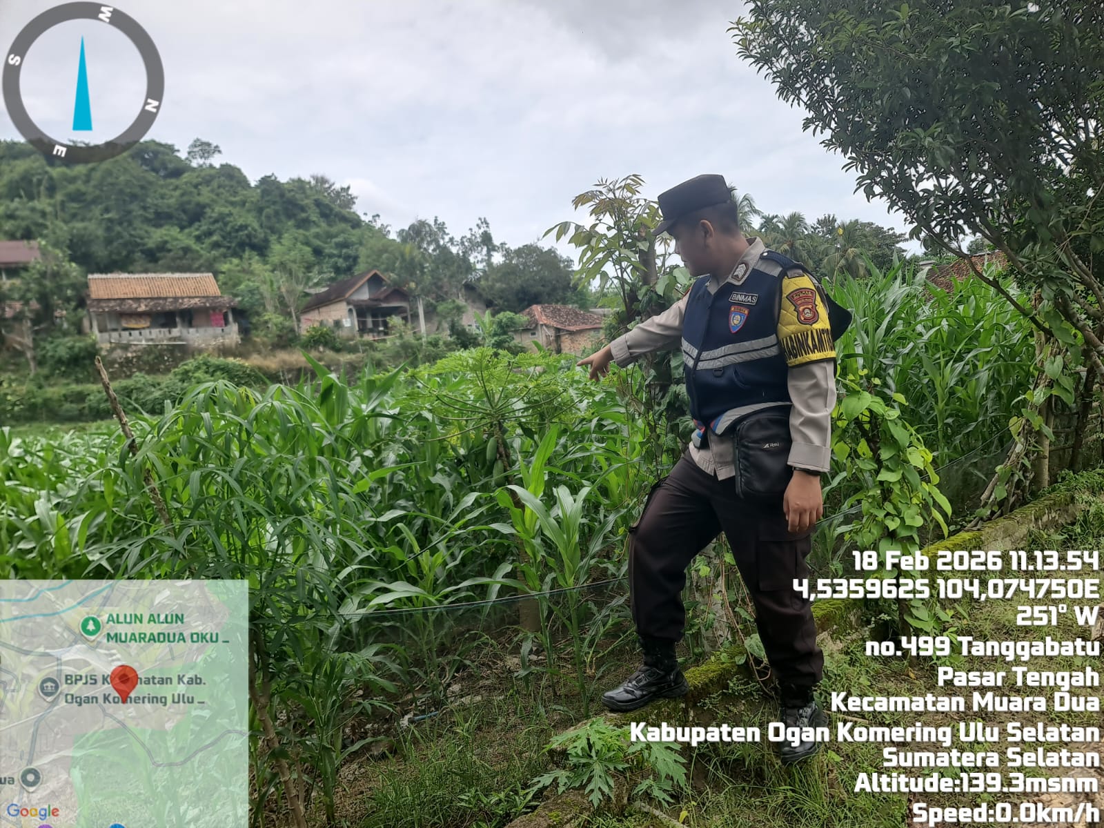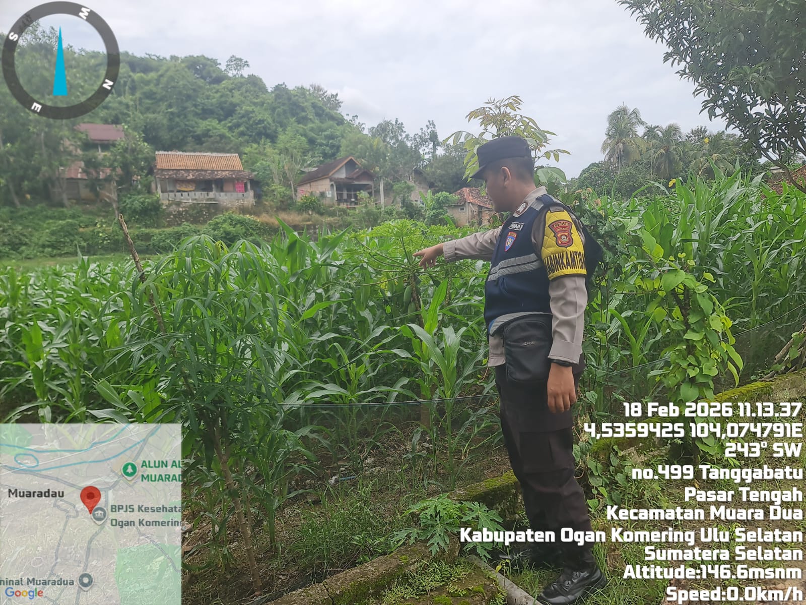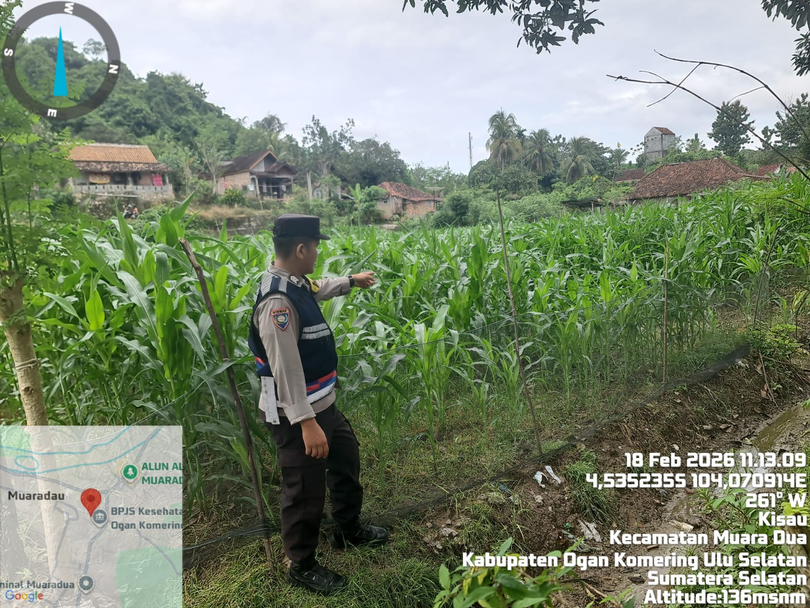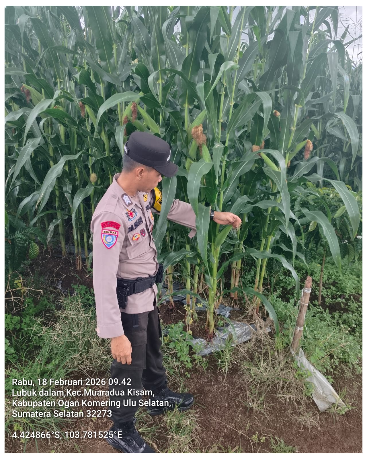 Bhabinkamtibmas Polsek Muaradua BRIGPOL Juanda melaksanakan kegiatan pengecekan lahan tanaman jagung di desa binaannya pada Rabu, 18 Februari 2026, pukul