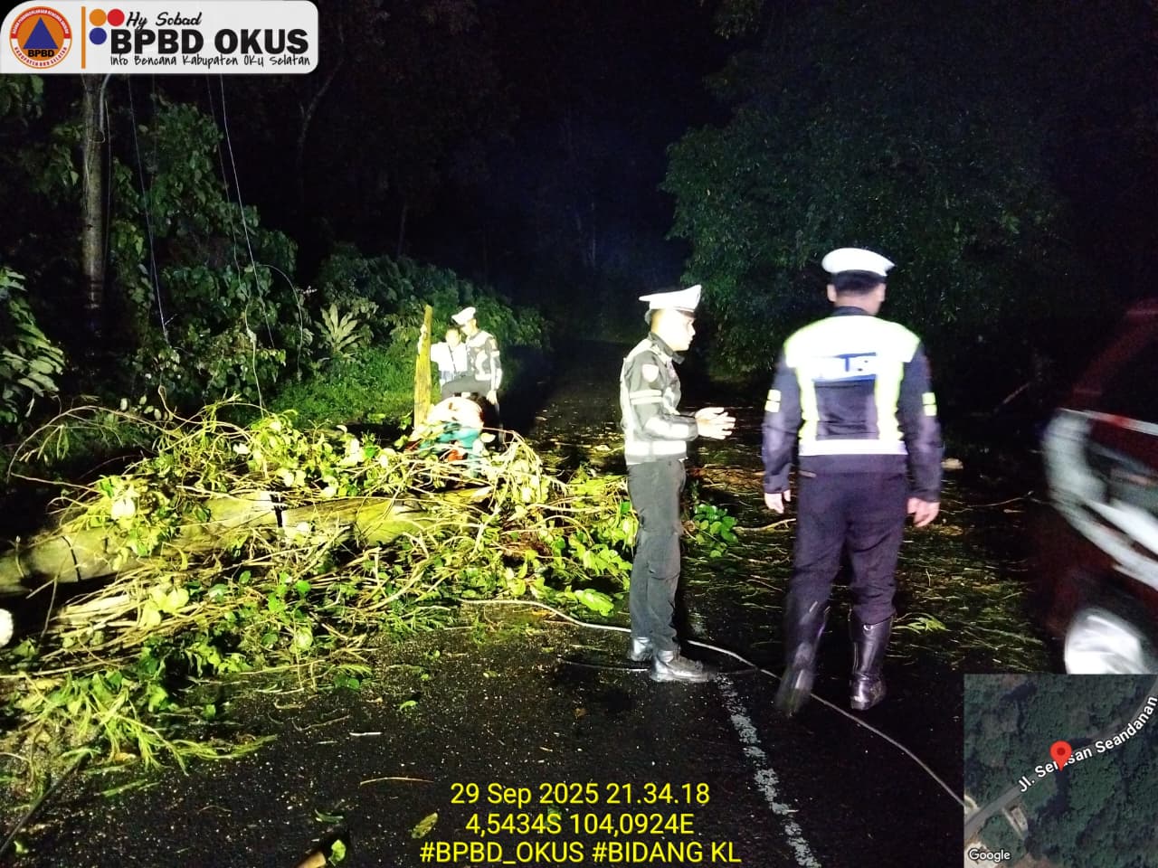 Anggota Satuan Lalu Lintas (Sat Lantas) Polres OKU Selatan melaksanakan giat pembersihan pohon tumbang yang menutupi badan jalan