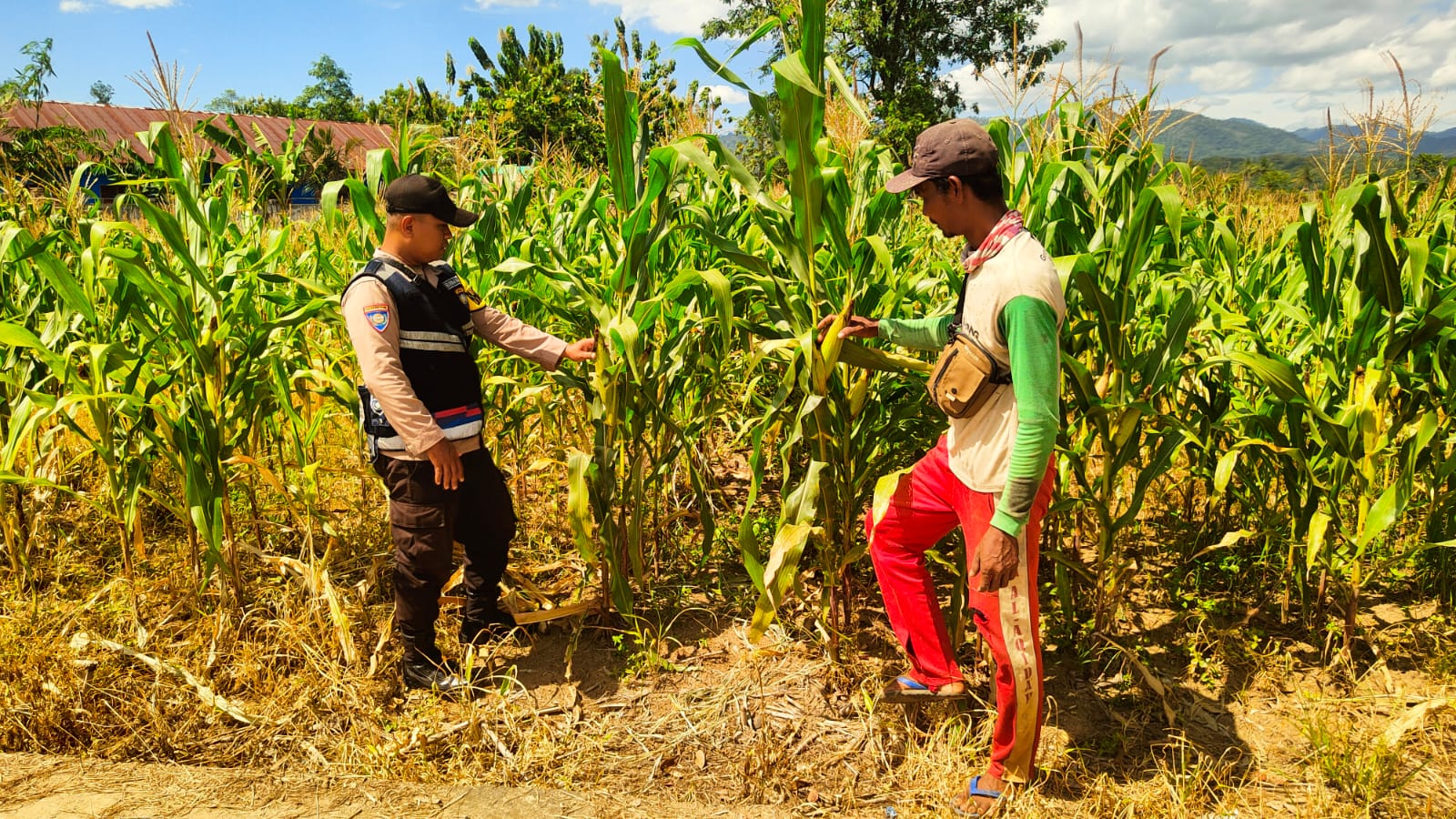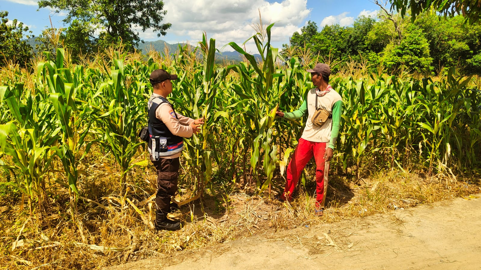Bhabinkamtibmas Polsek Simpang Martapura, Brigpol Fetriyanto, melaksanakan kegiatan pengecekan lahan tanaman jagung di Desa Sinar Mulyo, Kecamatan Simpang, Kabupaten OKU Selatan