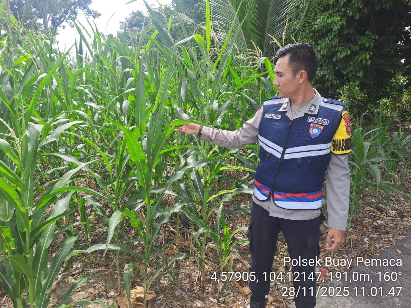 Buay Pemaca – Bhabinkamtibmas Polsek Buay Pemaca, Briptu Resfi Trio Herdinata, melaksanakan kegiatan pengecekan lahan ketahanan pangan berupa kebun jagung