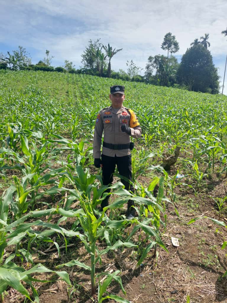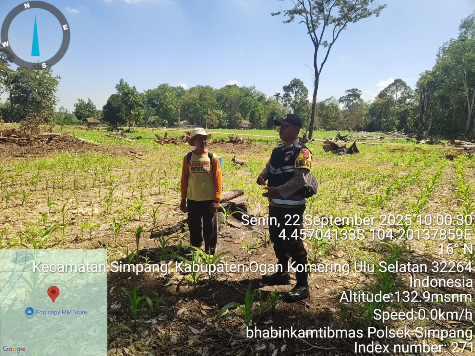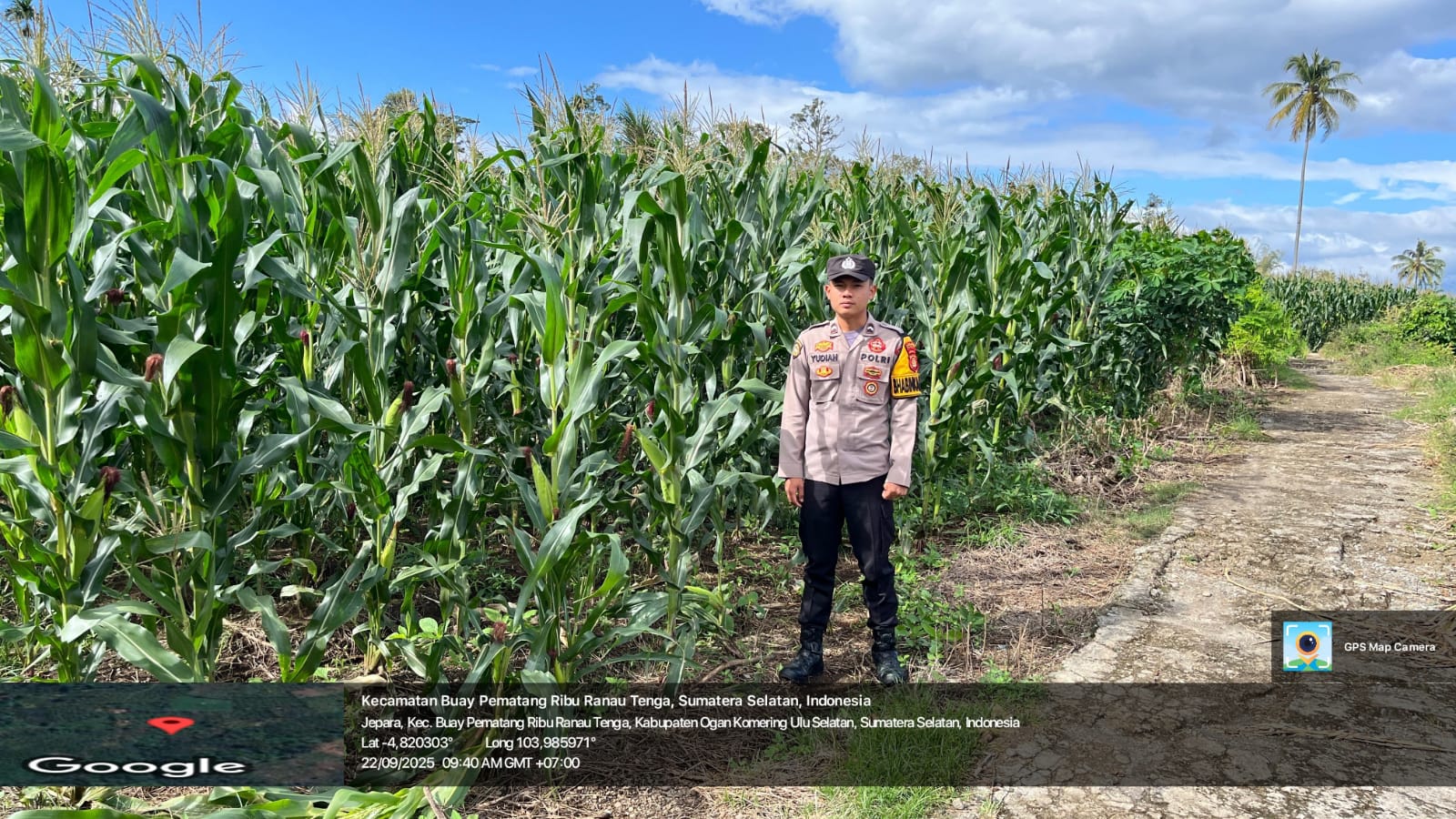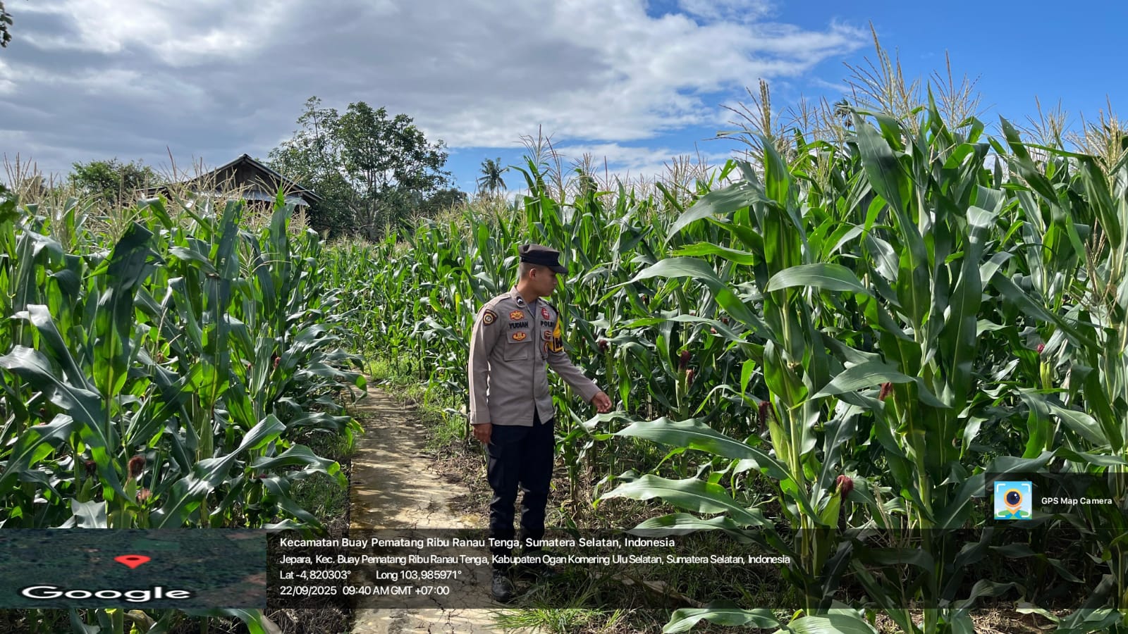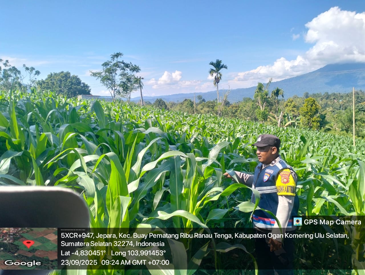 Bhabinkamtibmas Polsek Banding Agung Bripda Yudian Qomar Putra melaksanakan kegiatan pengecekan lahan tanaman jagung di Desa Simpang Sender Utara, Kecamatan BPR Ranau Tengah, Kabupaten OKU Selatan