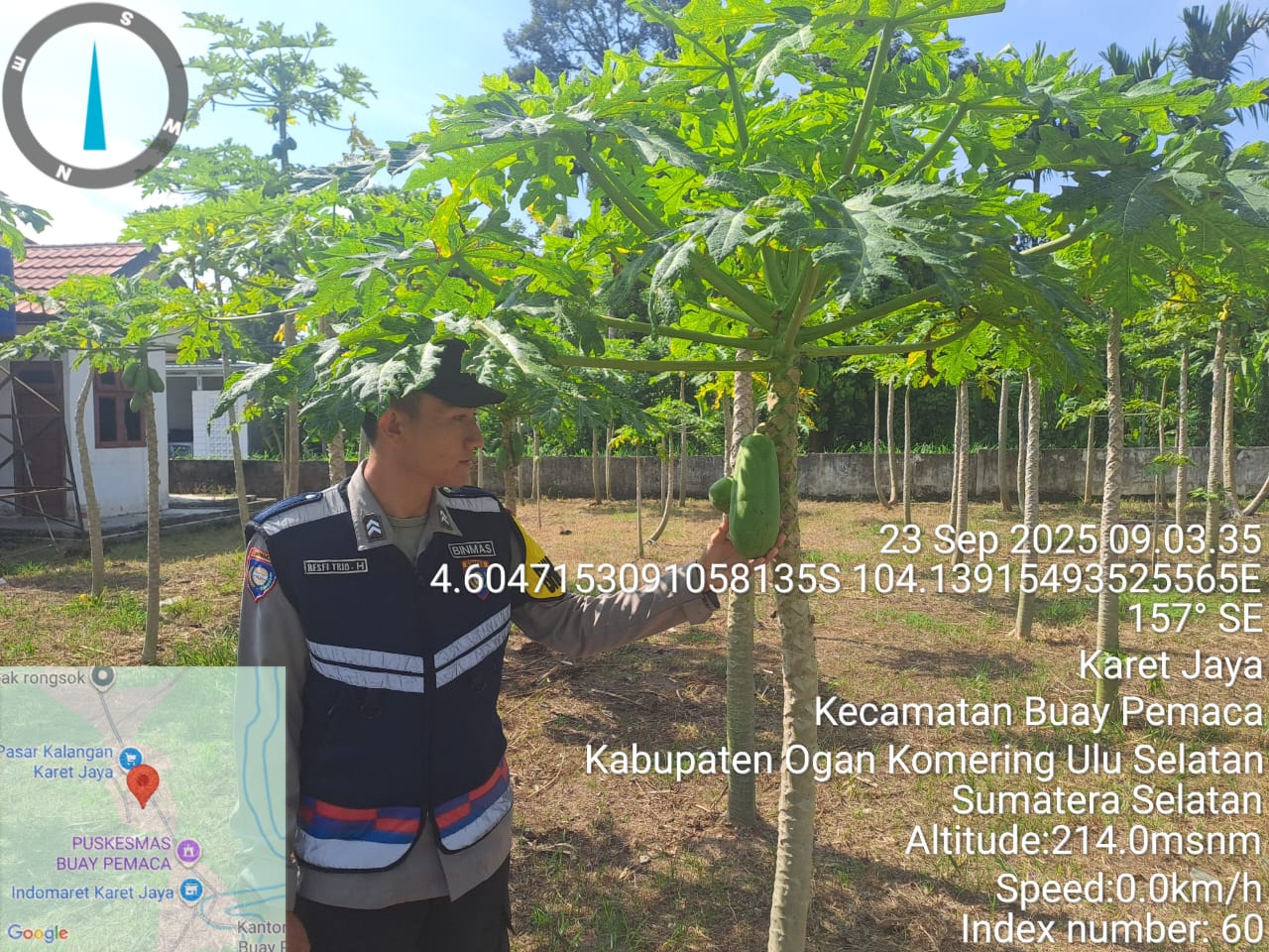 Buay Pemaca – Bhabinkamtibmas Polsek Buay Pemaca melaksanakan giat pengecekan lahan ketahanan pangan berupa kebun pepaya di Desa Karet Jaya,