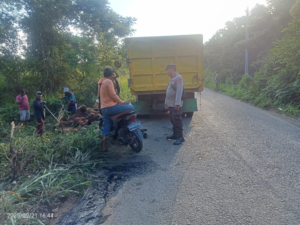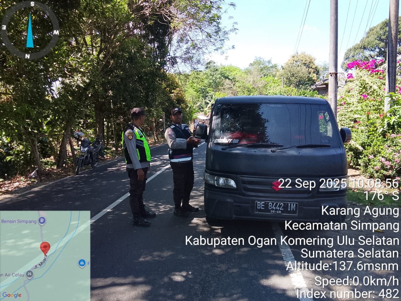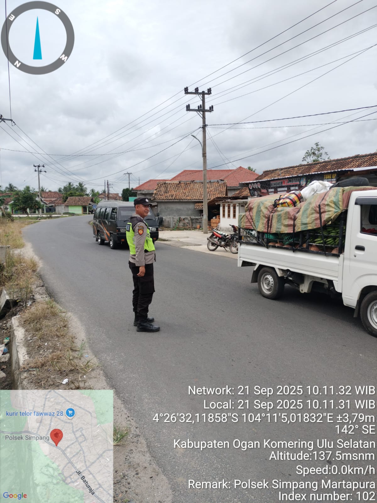 Anggota Polsek Buay Pemaca melaksanakan giat pengaturan lalu lintas di Jalan Pemkab Desa Sumber Raya, Kecamatan Buay Pemaca, Kabupaten OKU