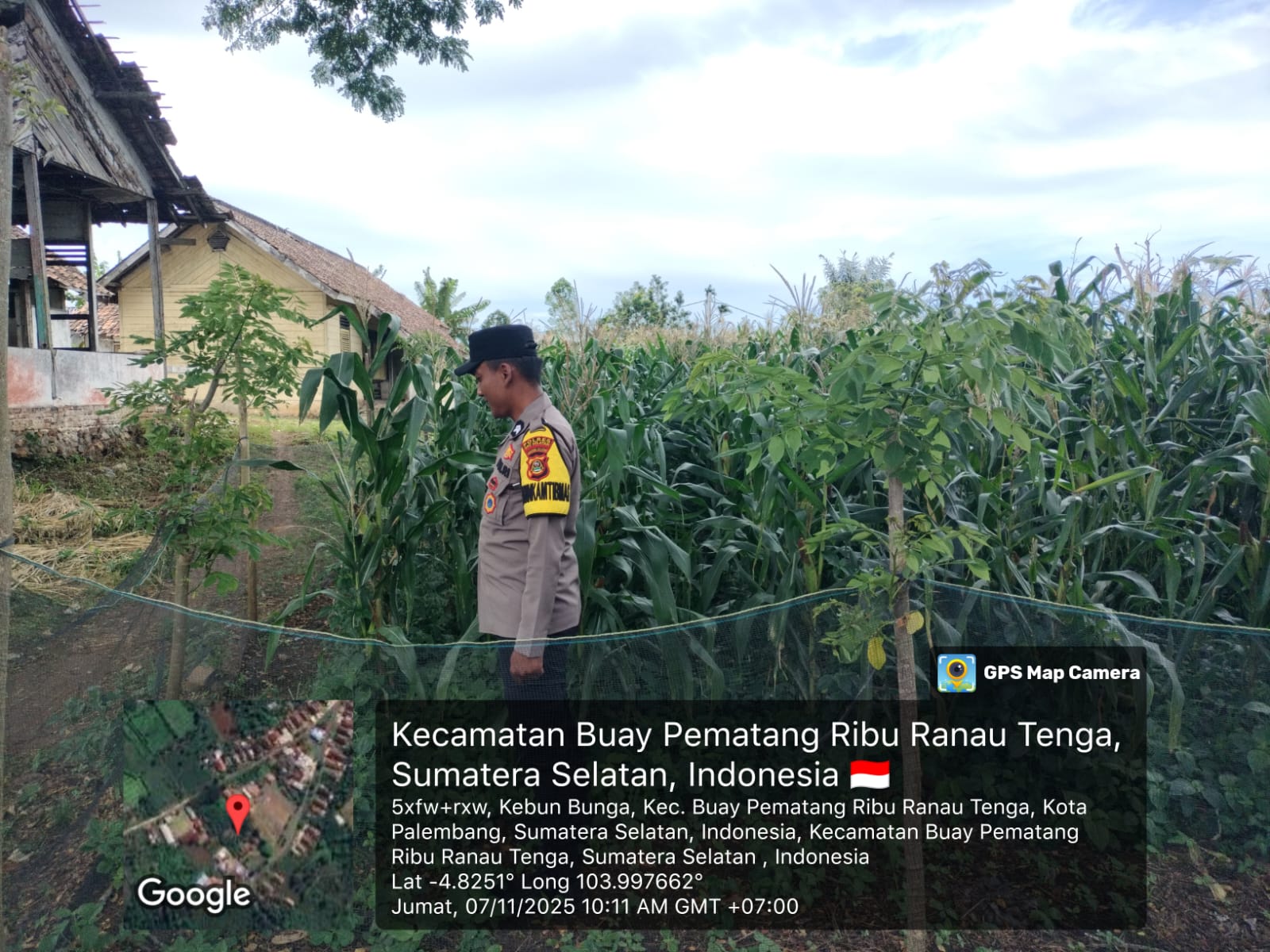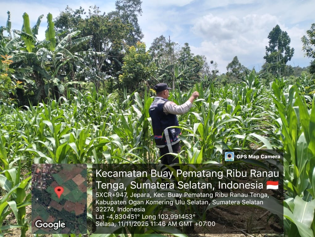 Bhabinkamtibmas Polsek Banding Agung Polres OKU Selatan Briptu Slamet Muhidin melaksanakan kegiatan pengecekan lahan ketahanan pangan berupa tanaman jagung di