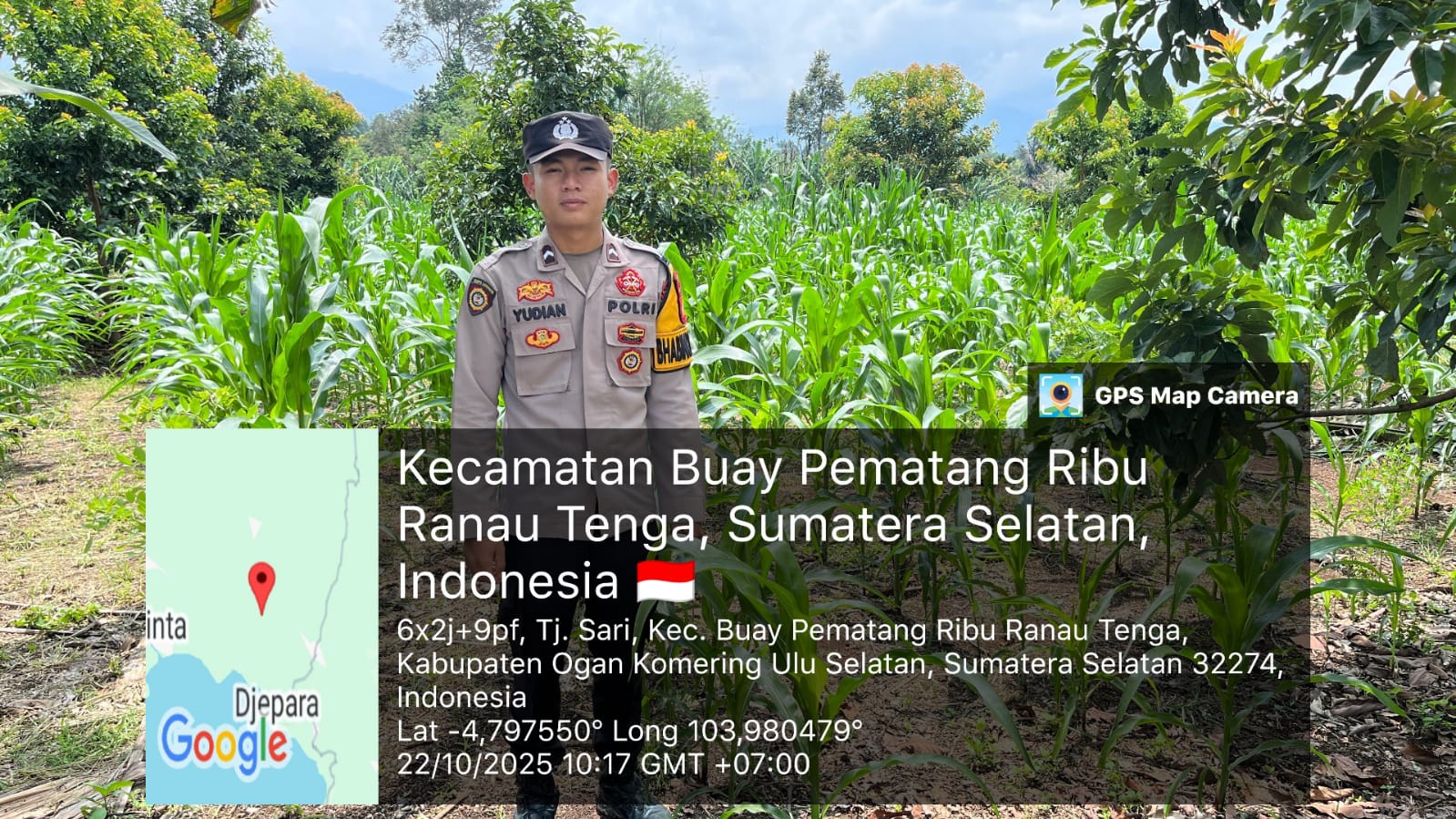 Bhabinkamtibmas Polsek Banding Agung Bripda Yudian Qomar Putra melaksanakan kegiatan pengecekan lahan tanaman jagung di Desa Simpang Sender Utara, Kecamatan BPR Ranau Tengah, Kabupaten OKU Selatan