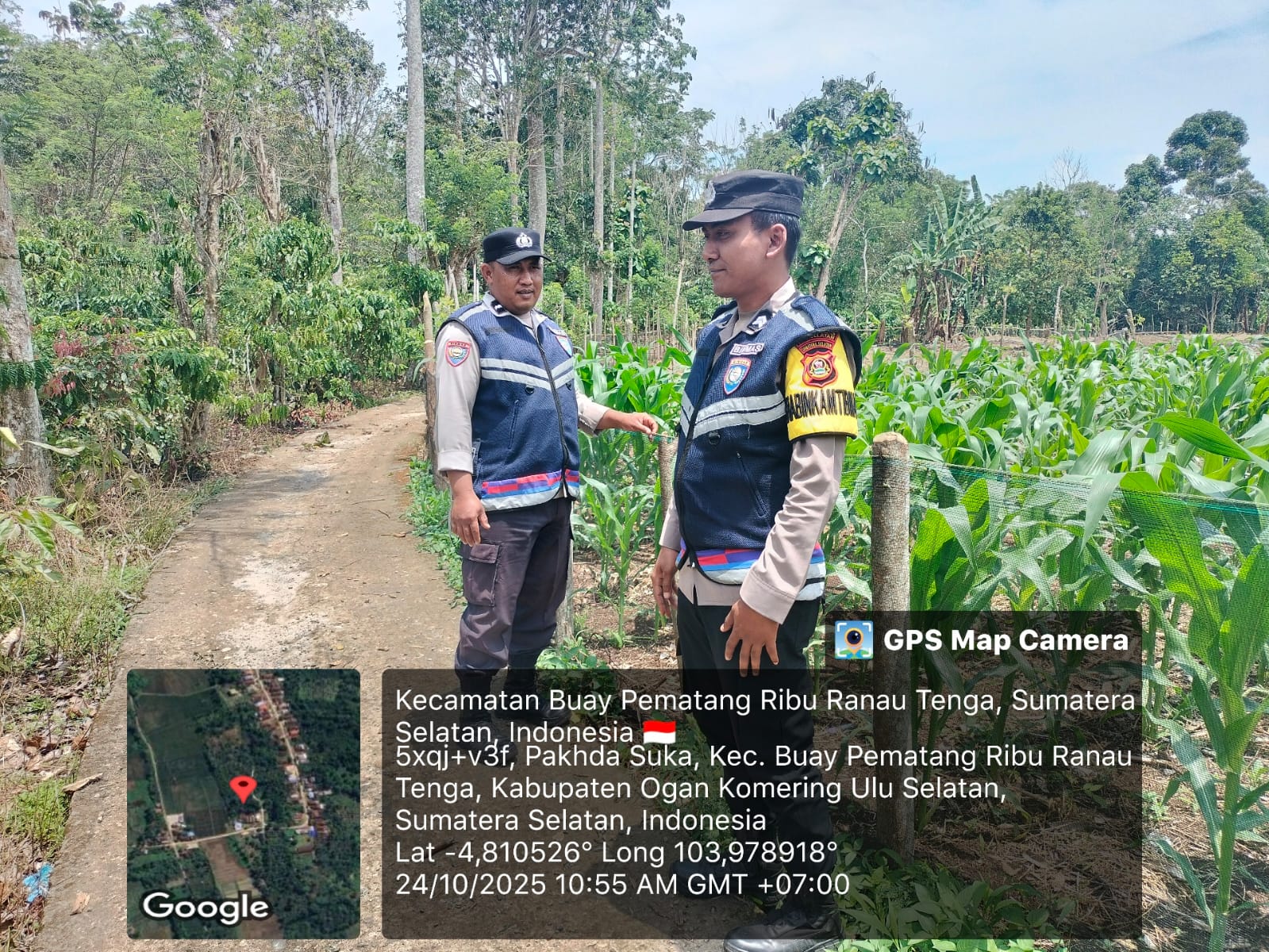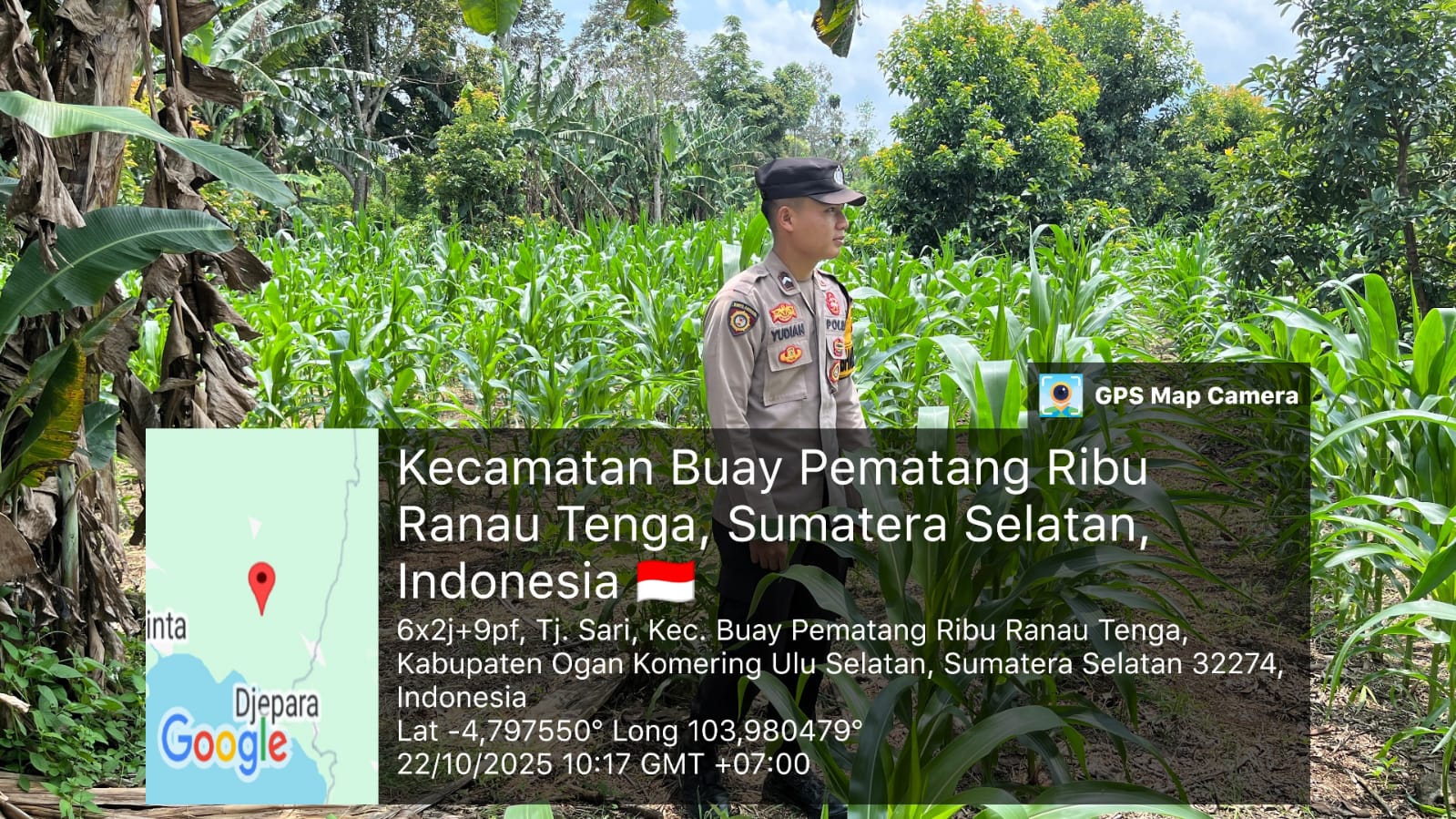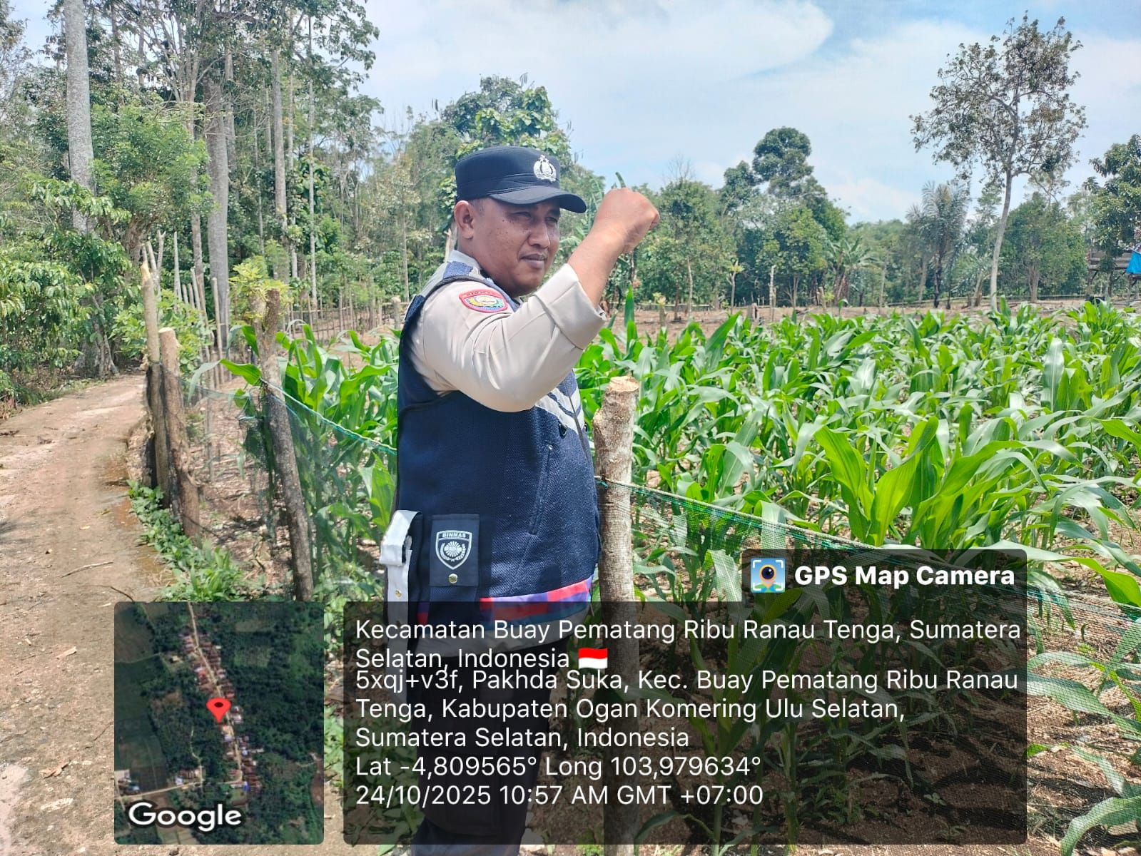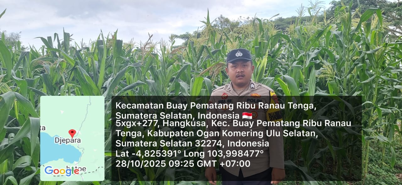 giat pengecekan lahan ketahanan pangan berupa kebun jagung yang berada di Desa Tanjung Jaya, Kecamatan Buay Pemaca, Kabupaten OKU Selatan oleh Bhabinkamtibmas Polsek Buay Pemaca