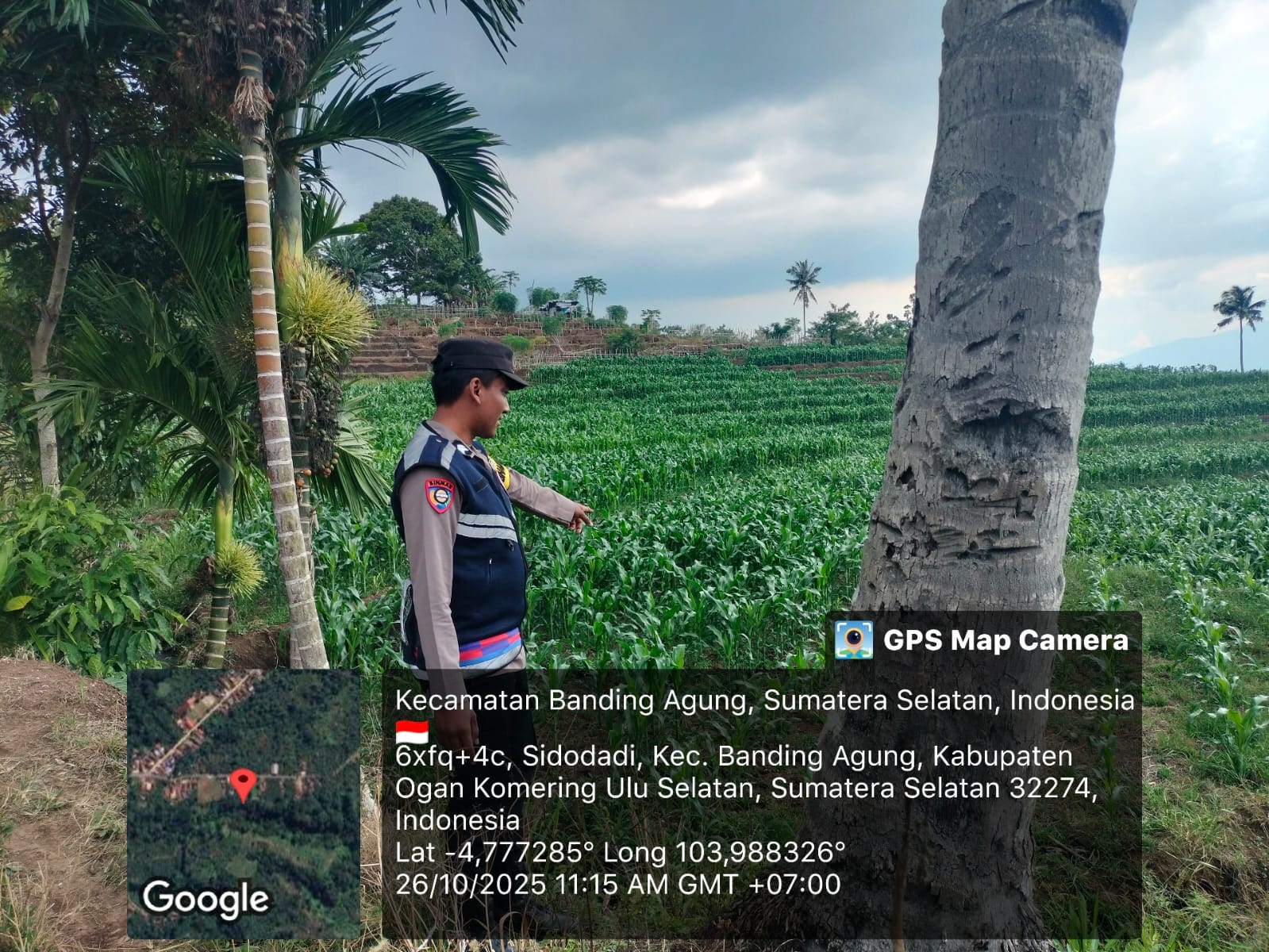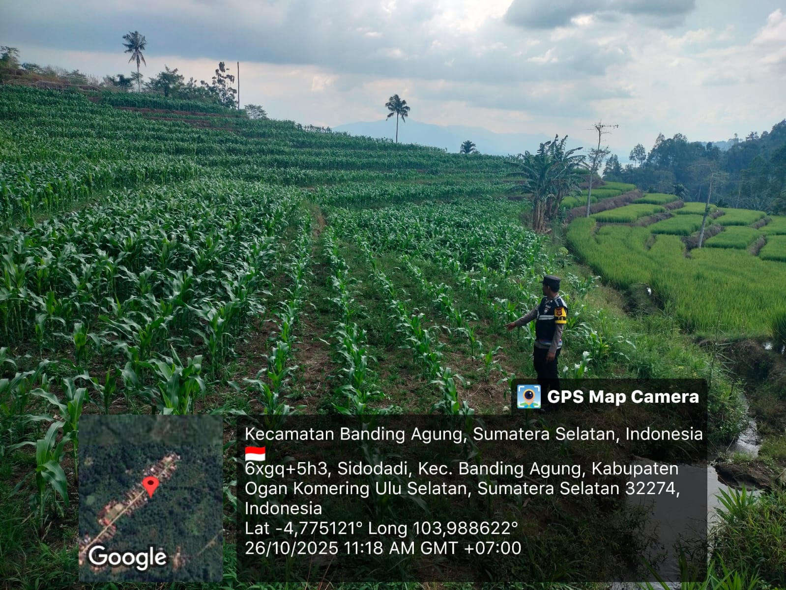 Banding Agung, OKU Selatan – Bhabinkamtibmas Polsek Banding Agung Bripda Yudian Qomar Putra melaksanakan kegiatan pengecekan lahan tanaman jagung di