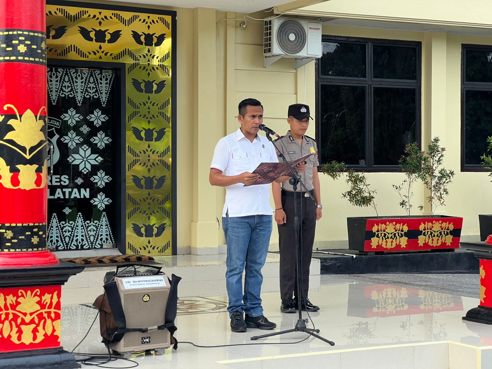 Personel Polres OKU Selatan melaksanakan apel pagi rutin yang dipimpin oleh Kasat Narkoba Polres OKU Selatan pada Rabu (10/12/2025) di
