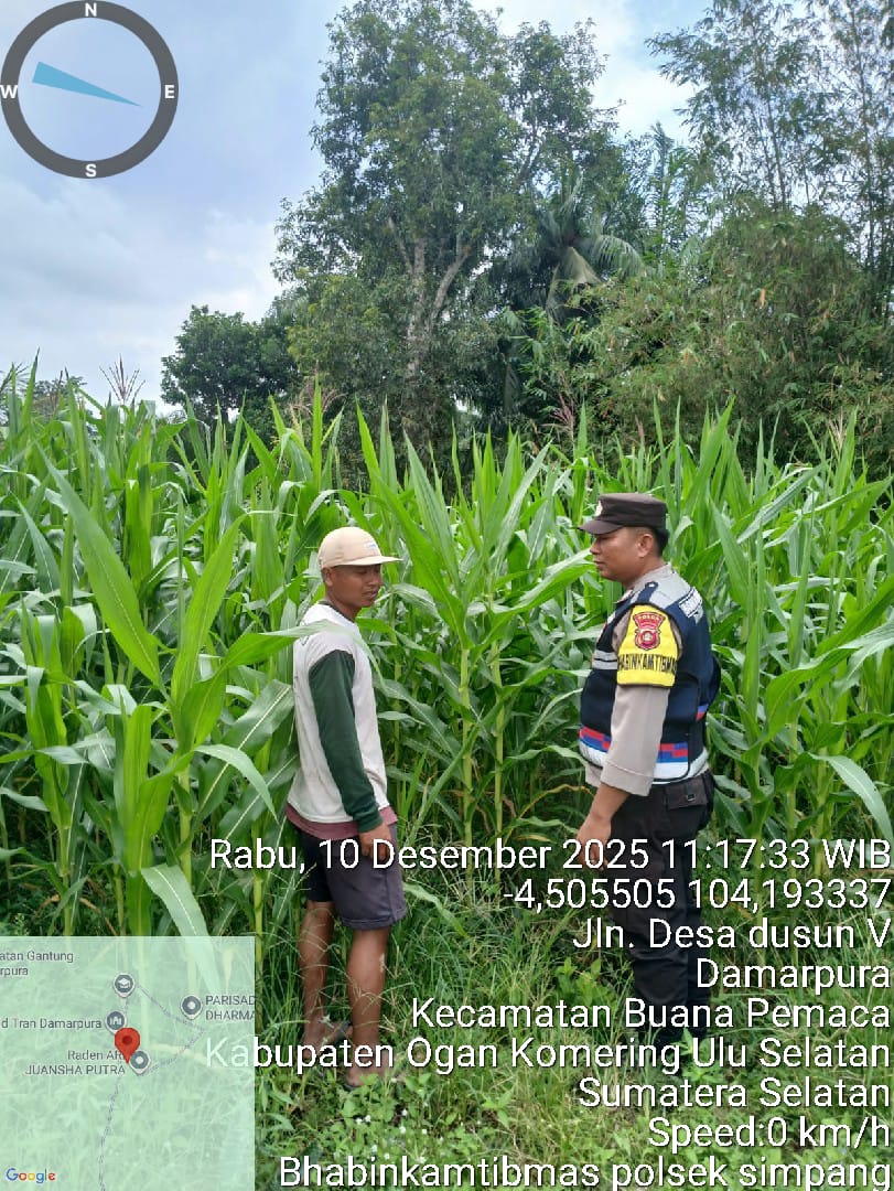 OKU Selatan, Jumat (12/12/2025) – Bhabinkamtibmas Polsek Simpang Martapura, Brigpol Dora Saputra, melaksanakan kegiatan pengecekan lahan tanaman jagung milik warga