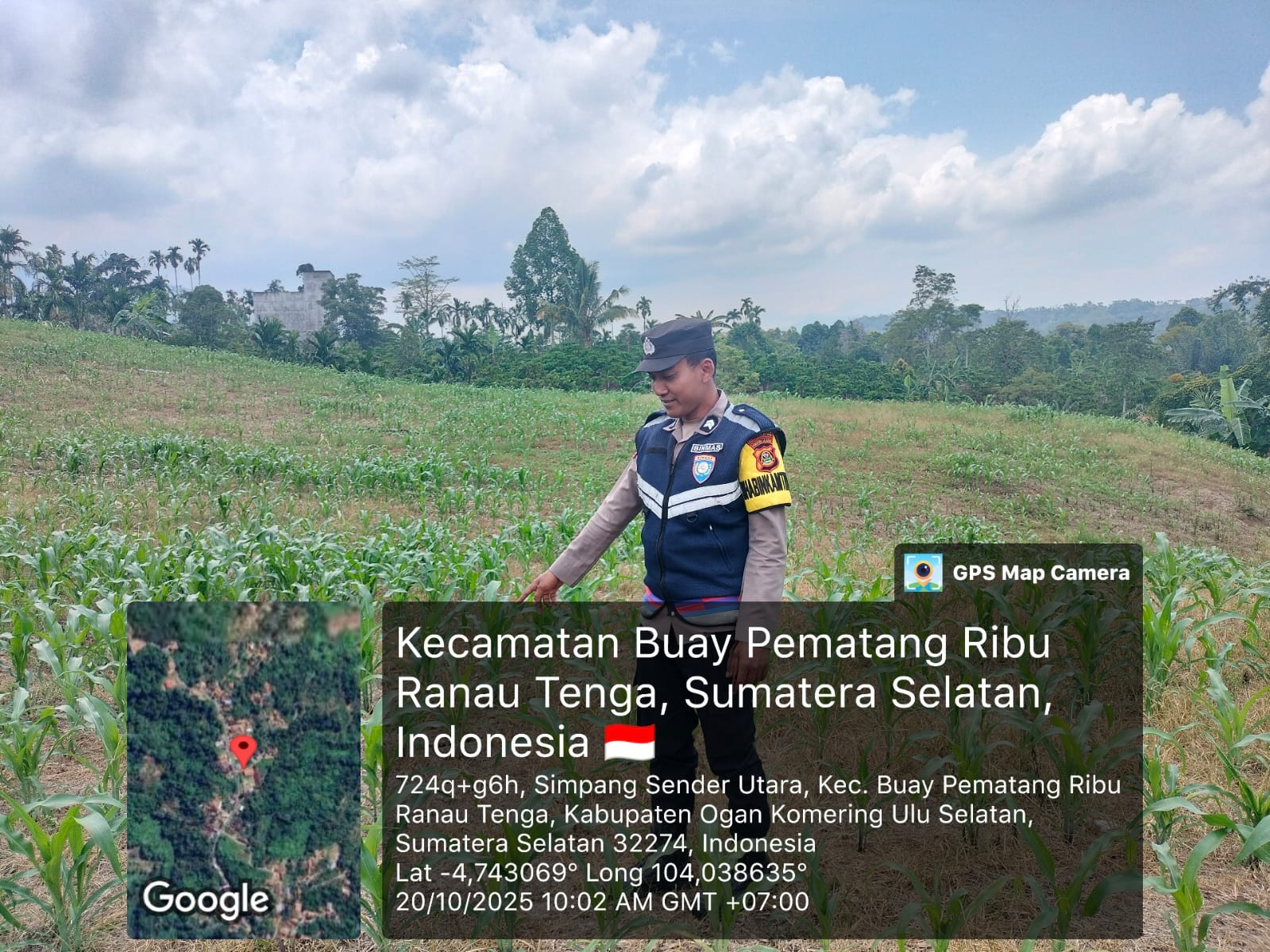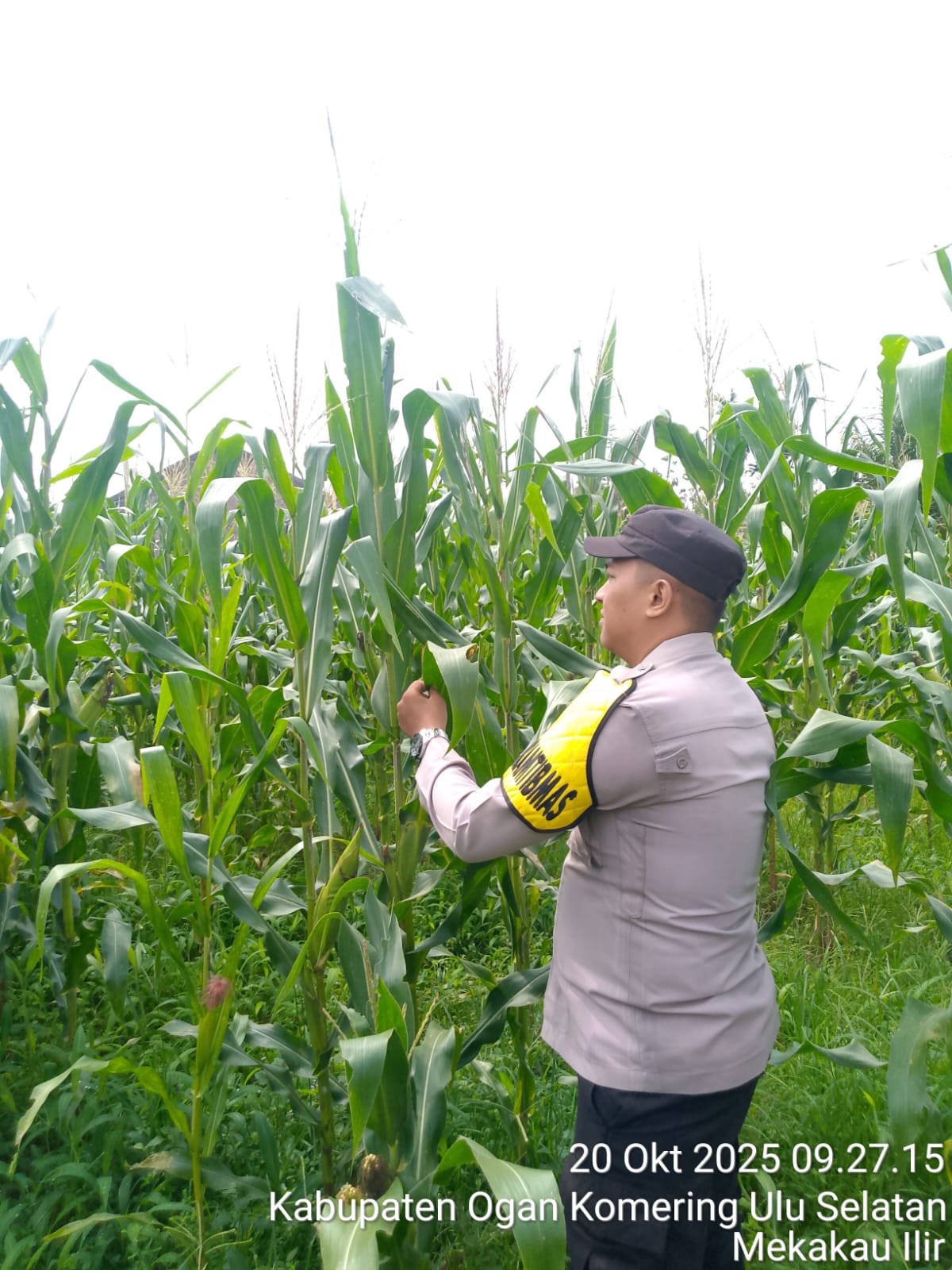 Bhabinkamtibmas Polsek Banding Agung Bripda Yudian Qomar Putra melaksanakan kegiatan pengecekan lahan tanaman jagung di Desa Simpang Sender Utara, Kecamatan BPR Ranau Tengah, Kabupaten OKU Selatan