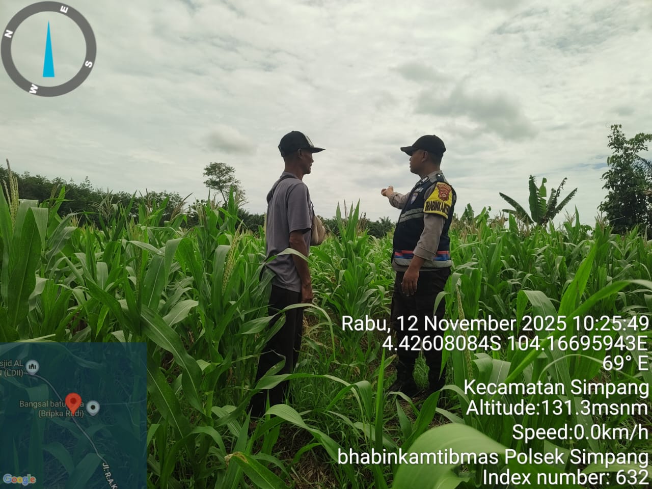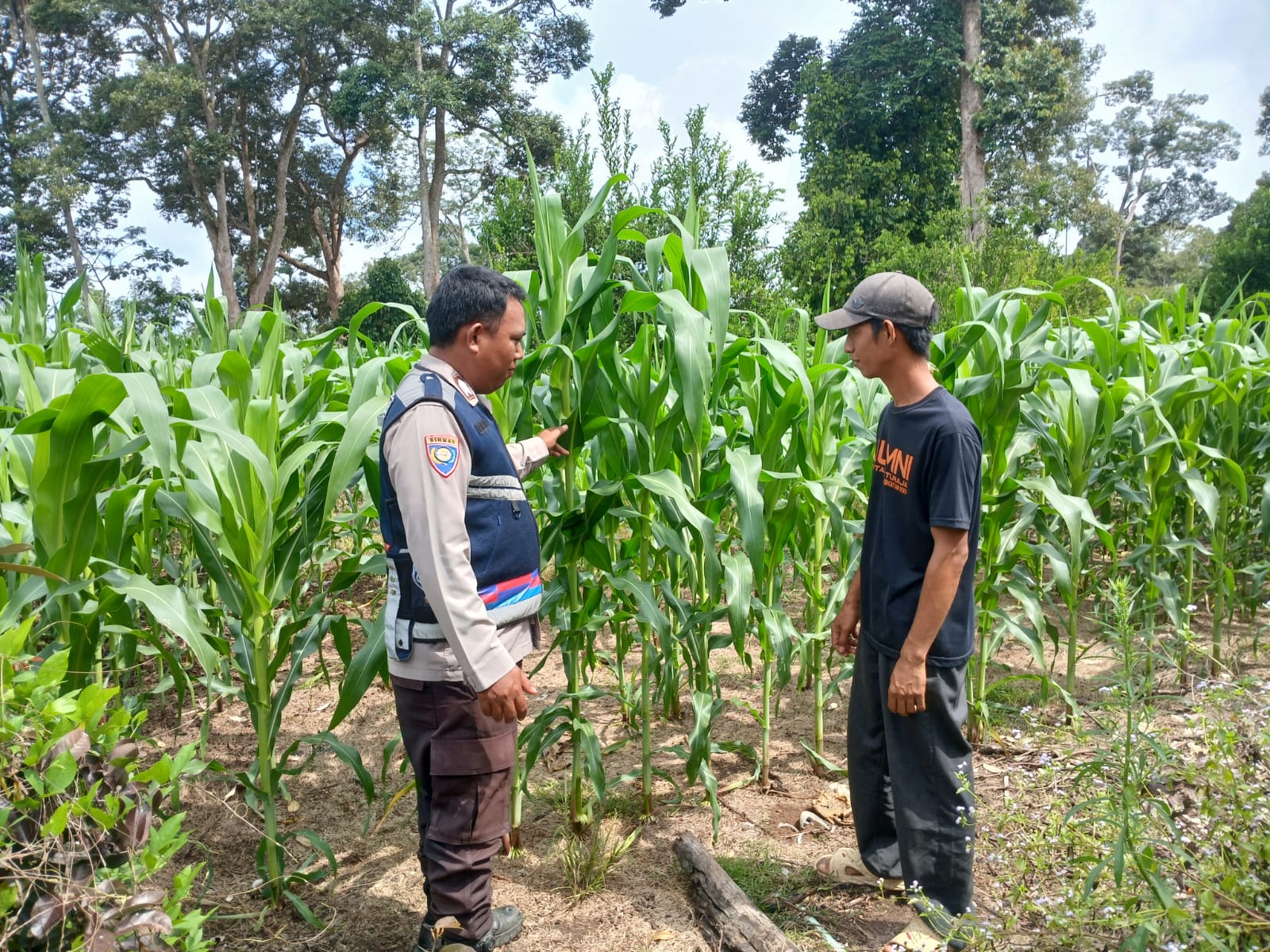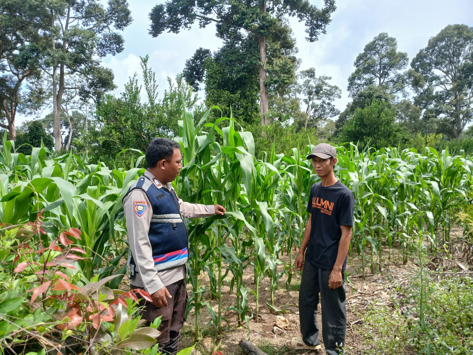 Bhabinkamtibmas Polsek Simpang Martapura, BRIGPOL FETRIYANTO, melaksanakan pengecekan lahan tanaman jagung di Desa Bungin Campang, Kecamatan Simpang, Kabupaten OKU Selatan.