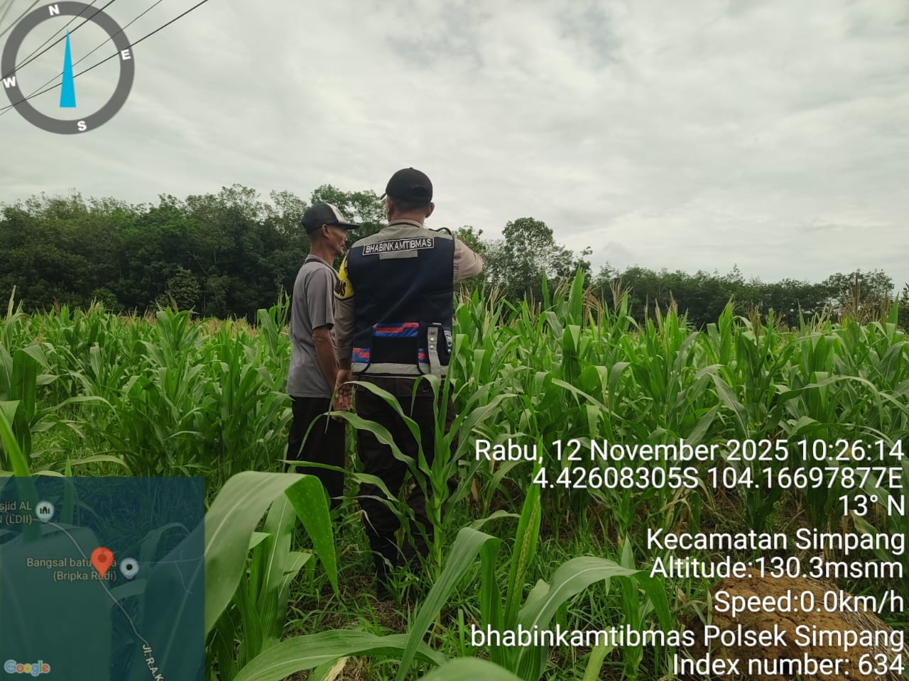 Bhabinkamtibmas Polsek Simpang Martapura, Brigpol Ahmad Susanto, melaksanakan kegiatan pengecekan lahan tanaman jagung di Desa Gemiung, Kecamatan Buana Pemaca, Kabupaten