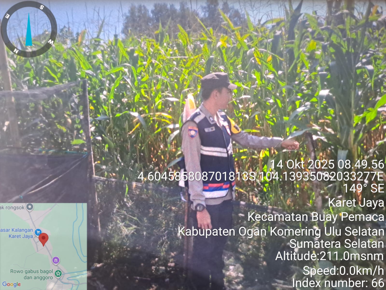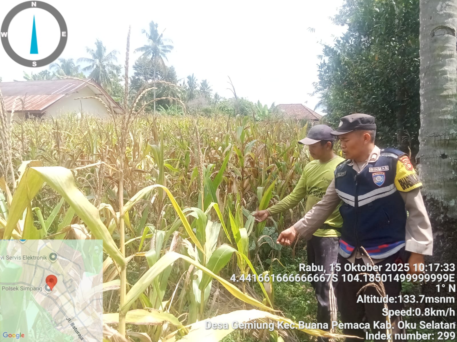 giat pengecekan lahan ketahanan pangan berupa kebun jagung yang berada di Desa Tanjung Jaya, Kecamatan Buay Pemaca, Kabupaten OKU Selatan oleh Bhabinkamtibmas Polsek Buay Pemaca