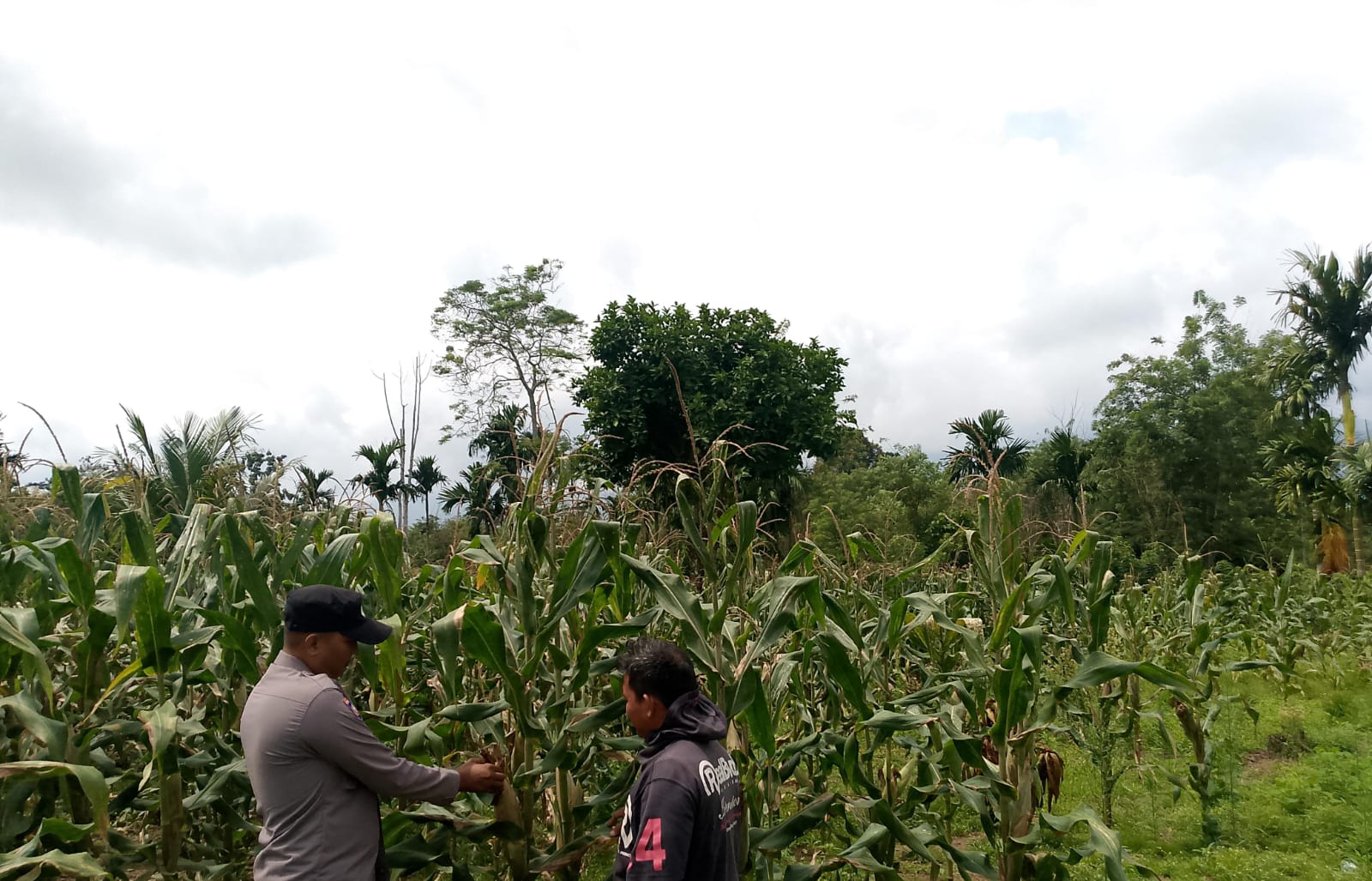 Bhabinkamtibmas Polsek Banding Agung Bripda Yudian Qomar Putra melaksanakan kegiatan pengecekan lahan tanaman jagung di Desa Simpang Sender Utara, Kecamatan BPR Ranau Tengah, Kabupaten OKU Selatan