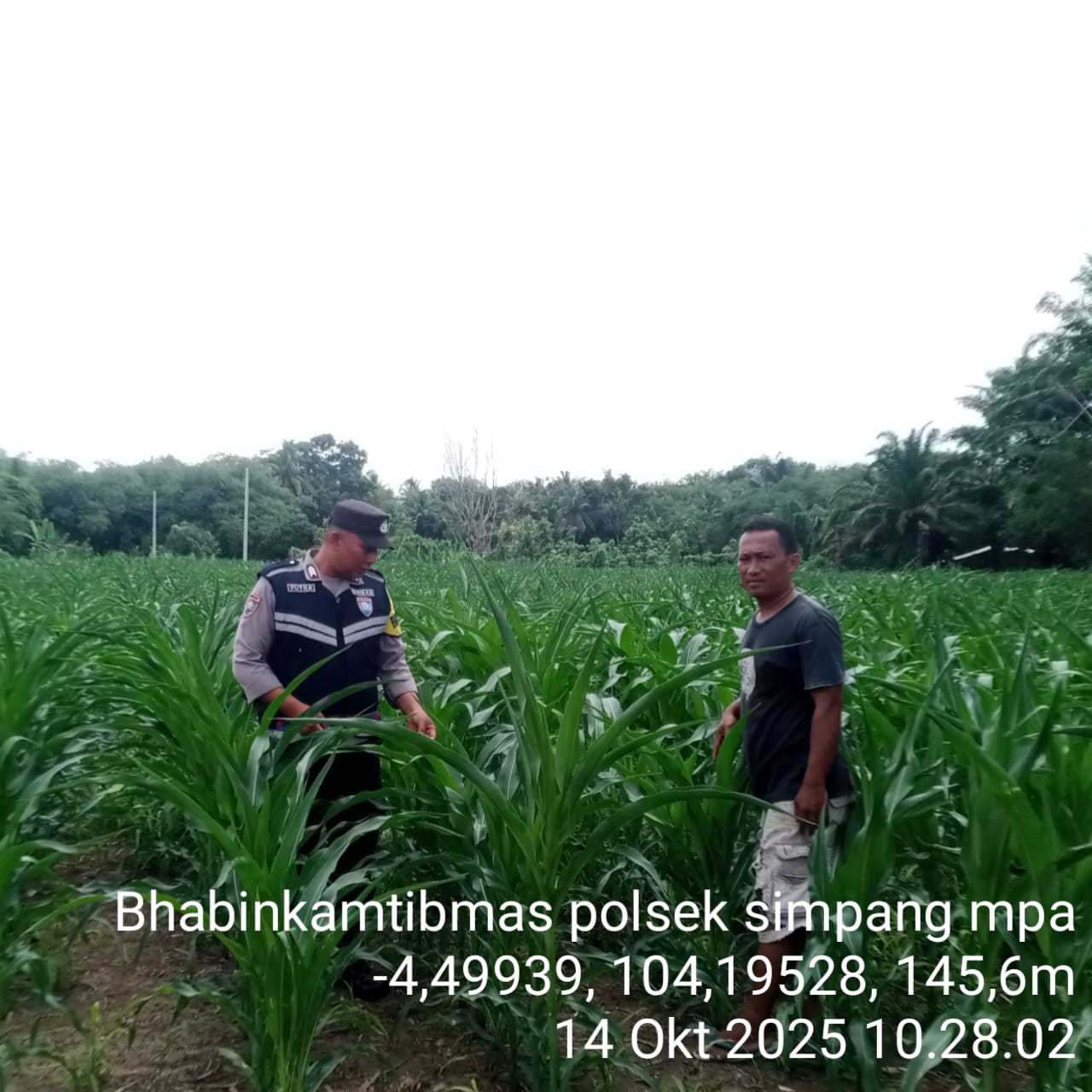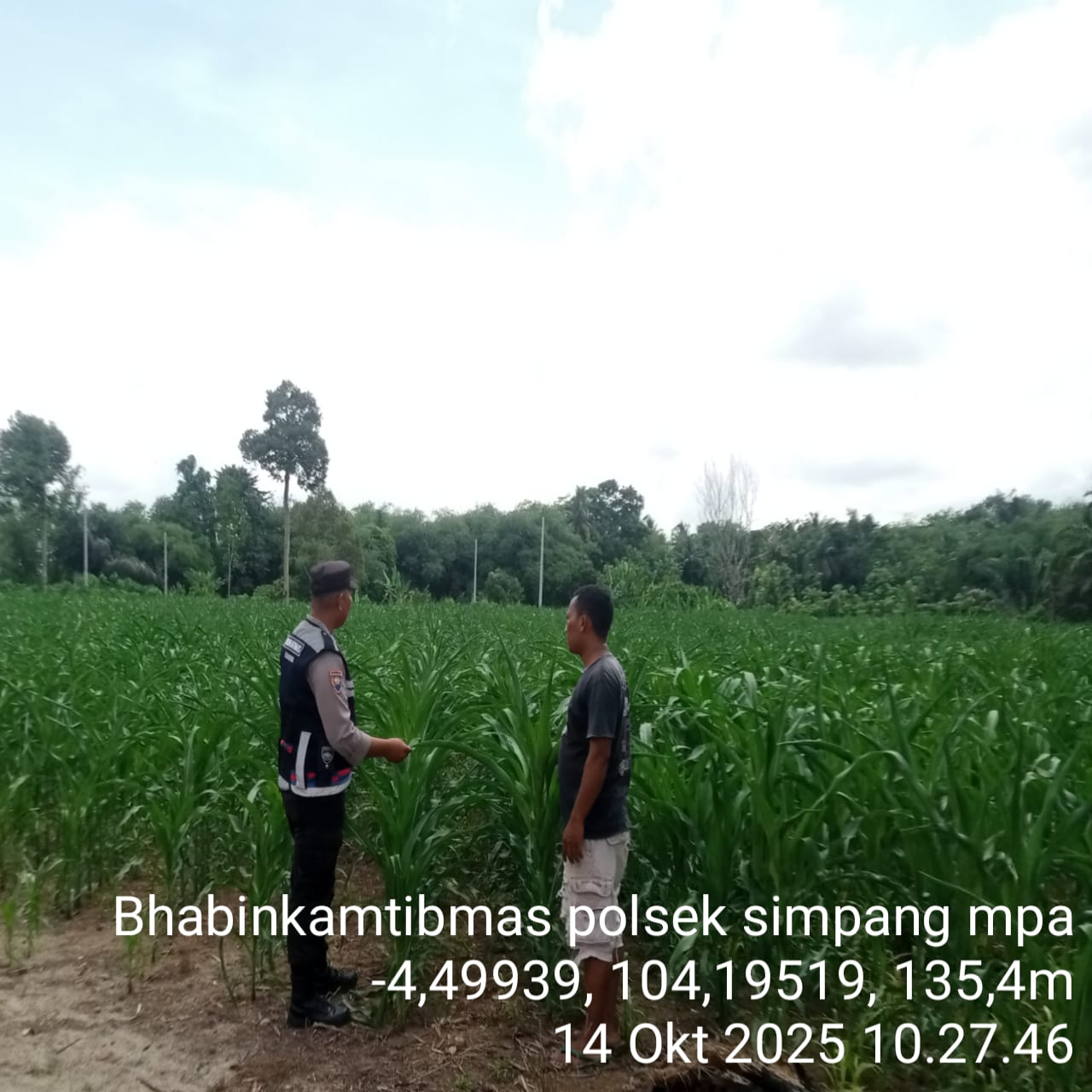 Bhabinkamtibmas Polsek Simpang Martapura BRIGPOL DEBI PRANATA melaksanakan giat pengecekan lahan tanaman jagung di Desa Binaan, Desa Sinar Danau, Kecamatan